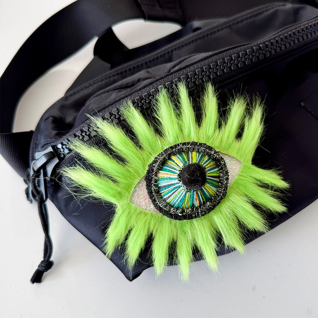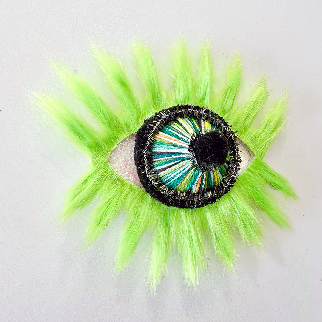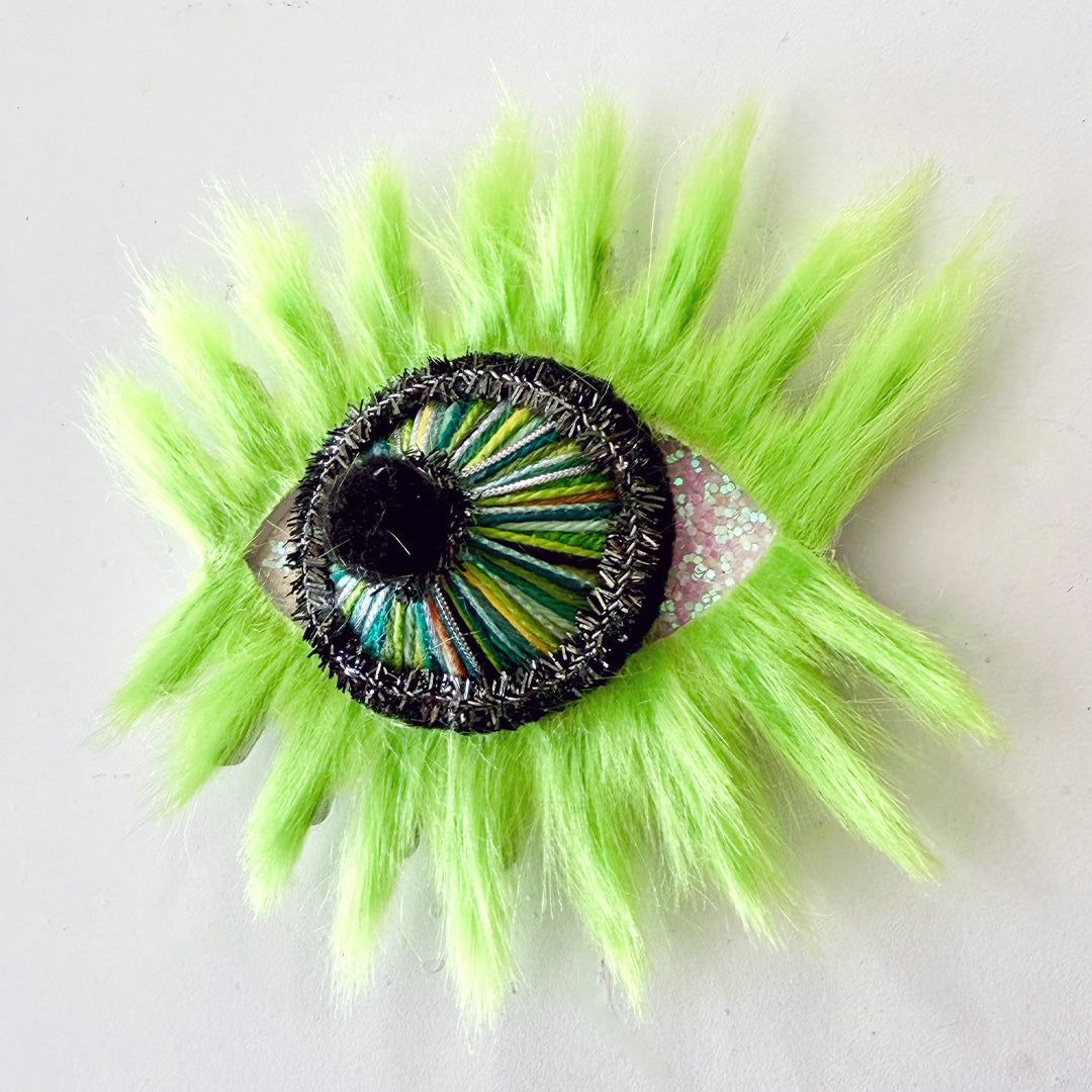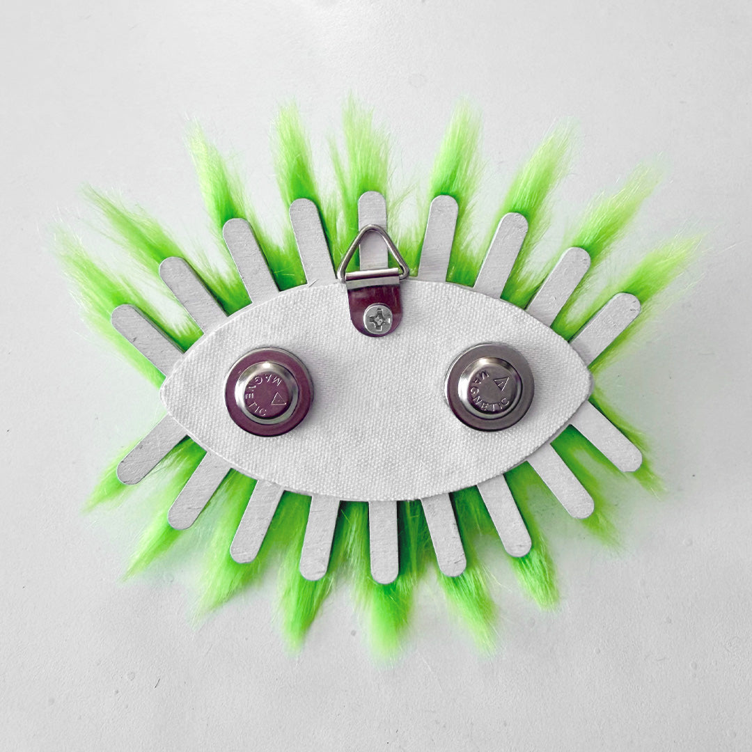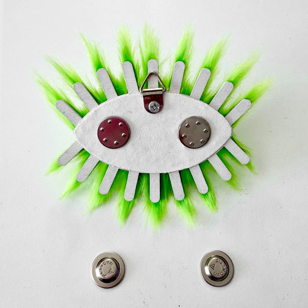 - medium: faux fur, yarn, string, pipe cleaners, pom pom, acrylic paint, glitter, canvas, metal hardware, magnets and adhesive on wood