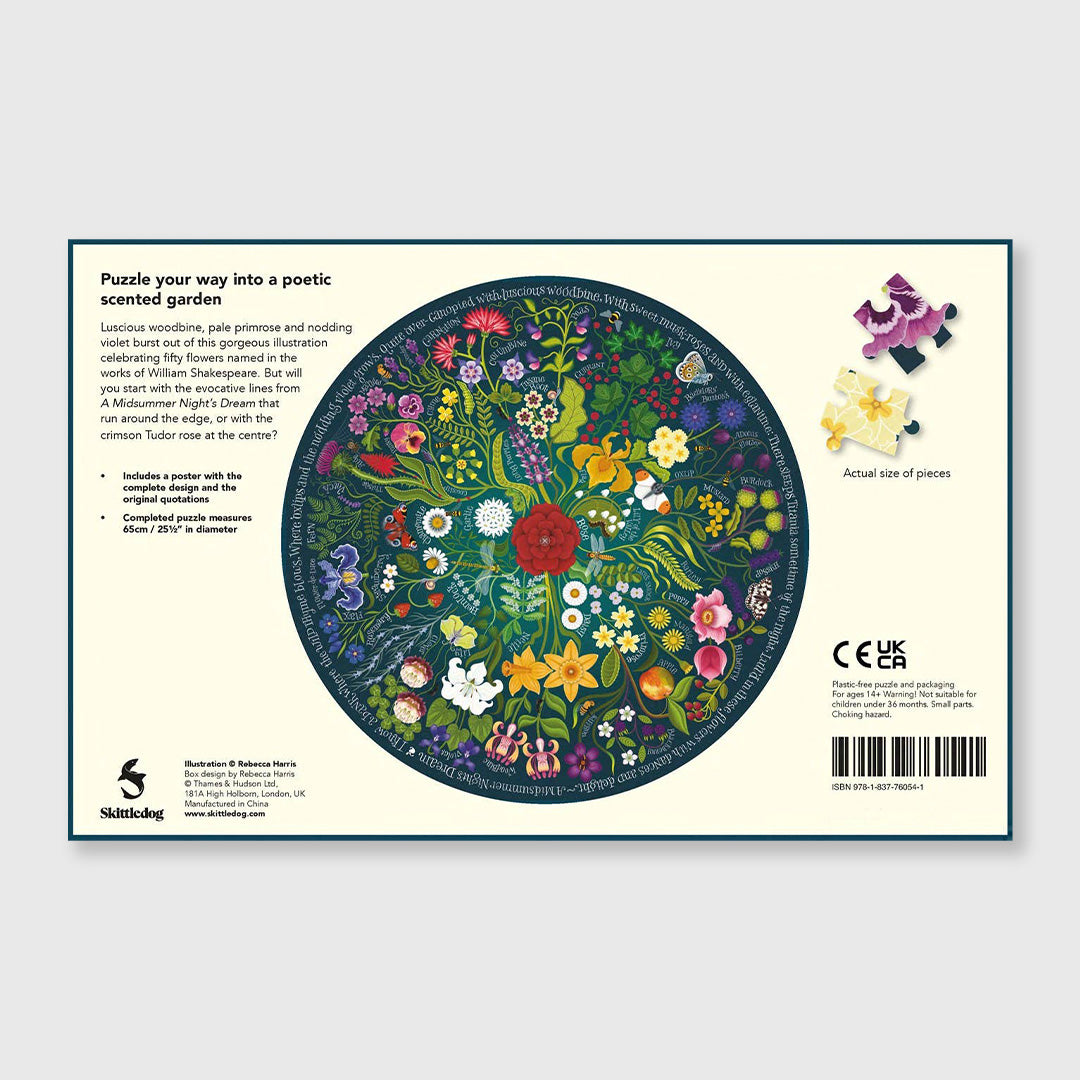 Roses, lilies, violets, and marigolds are among the 50 flowers, all featured in the works of Shakespeare, that wind around this beautifully literary circular jigsaw puzzle.
