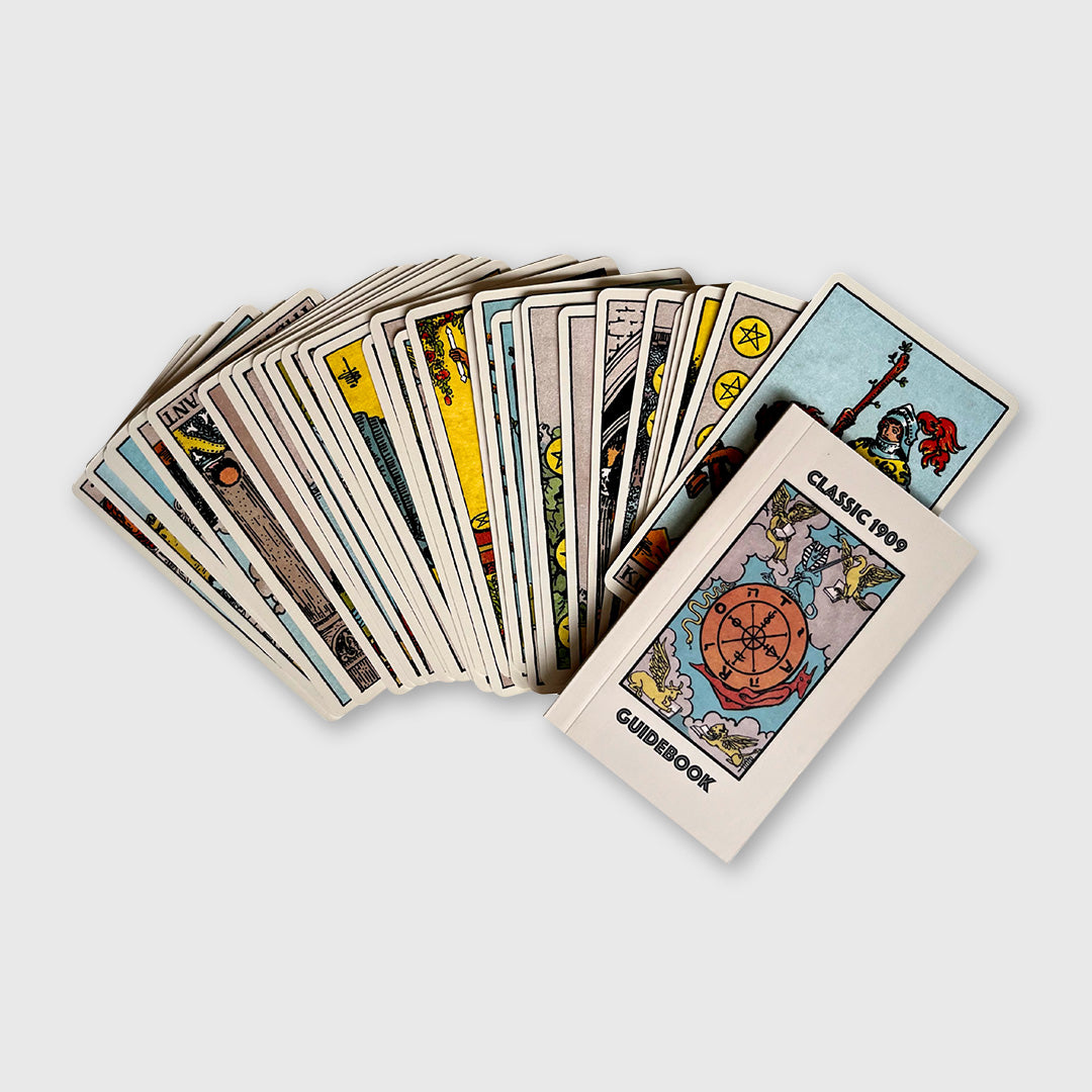 Step into the mystical world of divination with our meticulously crafted Classic 1909 Tarot Deck. Pulled directly from the iconic designs of the early 20th century, this deck transports you to a bygone era of spiritual exploration and enlightenment. Each card in this timeless deck is a work of art, meticulously recreated to capture the essence of the original 1909 Rider-Waite Tarot deck with art by Pamela Colman. The intricate illustrations, rich symbolism, and vibrant colors evoke a sense of wonder and mystery, inviting you to embark on a journey of self-discovery and introspection. Whether you're a seasoned tarot enthusiast or just beginning your journey into the realm of divination, our Classic 1909 Tarot Deck is the perfect companion. With its intuitive design and timeless wisdom, it offers valuable insights and guidance into life's most pressing questions and uncertainties.
