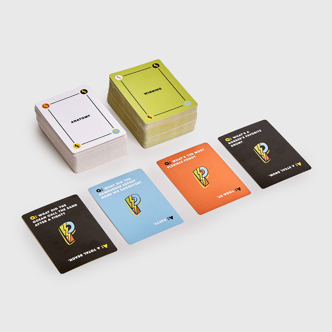 One part game, one part conversation starter, you don't need to be a pun master to master Punderdome: the goal is to make bad jokes and have fun in the process. A player (the prompter for that round) draws two prompt cards from the deck, reading the prompts to the rest of the group, who have 90 seconds to create a single, groan-worthy pun that combines the two prompts. When time is up, pun makers share their pun with the prompter, who awards the prompt cards to the player whose pun they like best. The winner then draws the next pair of prompt cards and the process repeats. Players win by obtaining 10 pairs of cards. The card game is inspired by the live game show Punderdome 3000, created by our authors, father-daughter duo Jo and Fred Firestone. Since its start in 2011, Punderdome 3000 has become a cult favorite in Brooklyn nightlife.