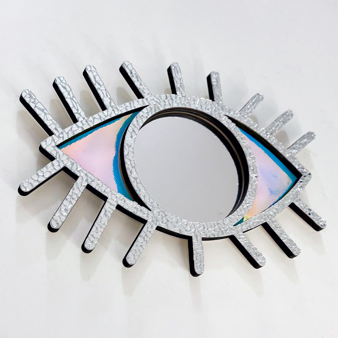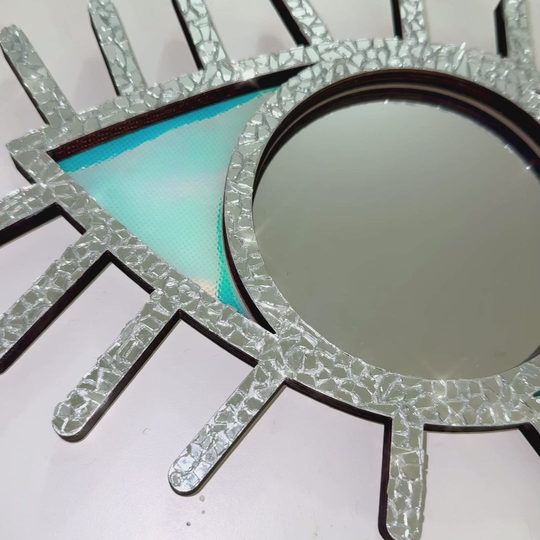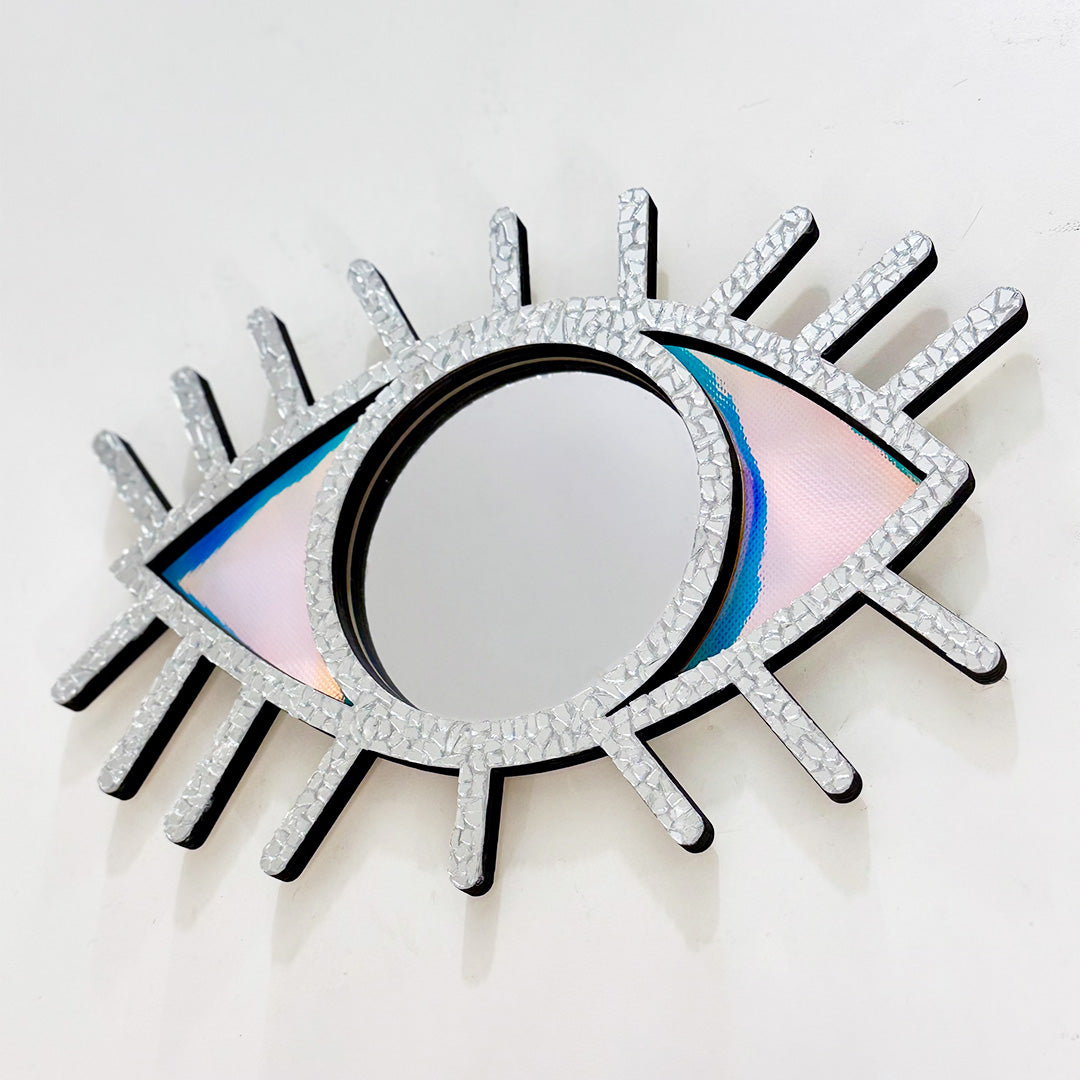 - medium: mirror tiles, circular mirror, acrylic paint, iridescent fabric, adhesive on wood