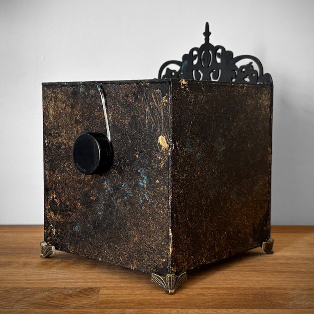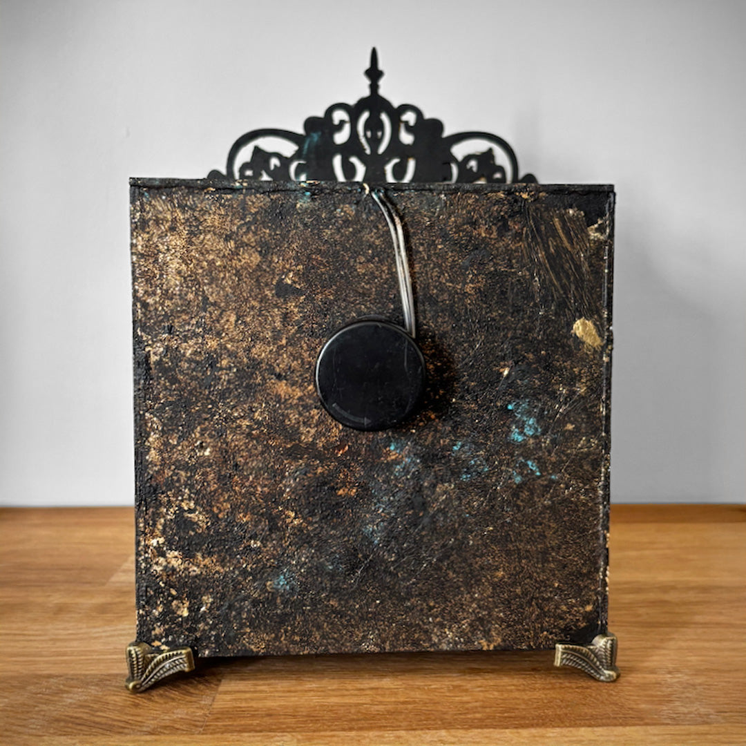 - medium: medite, acrylics, polymer clay, glass, flock, resin, wire, imitation gold leaf, mulberry paper, and lichen