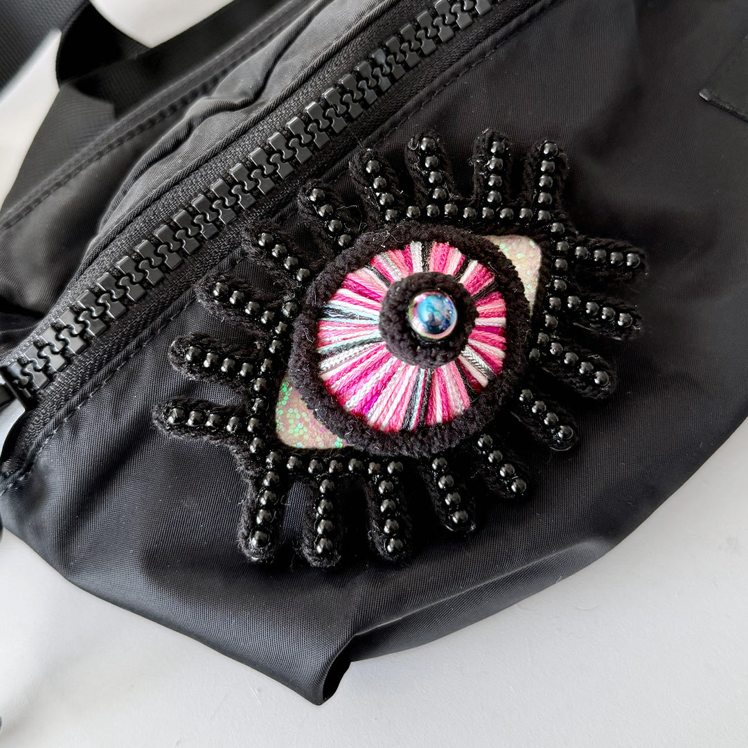 - medium: acrylic beads, yarn, string, pipe cleaners, acrylic paint, glitter, canvas, metal hardware, magnets and adhesive on wood