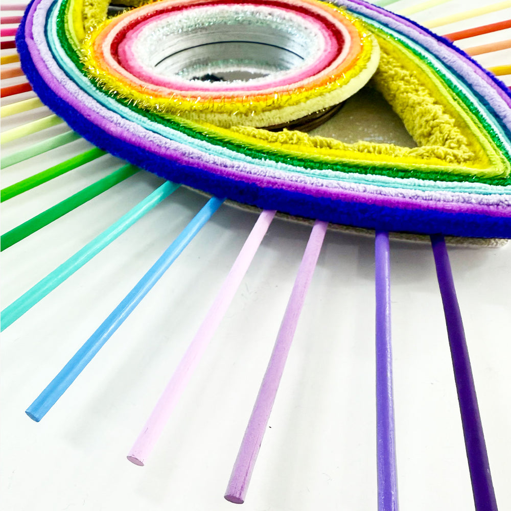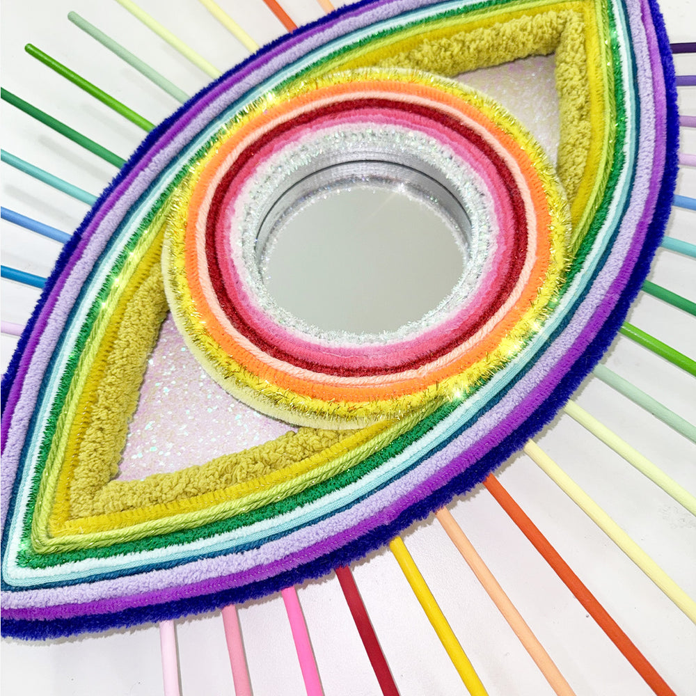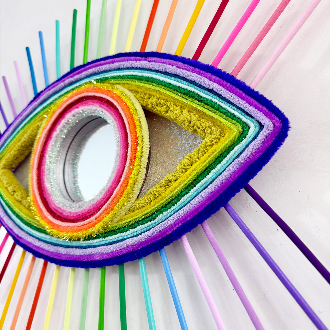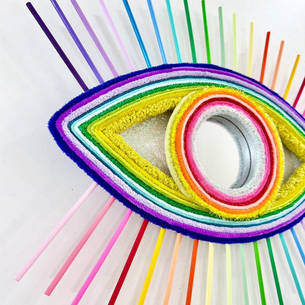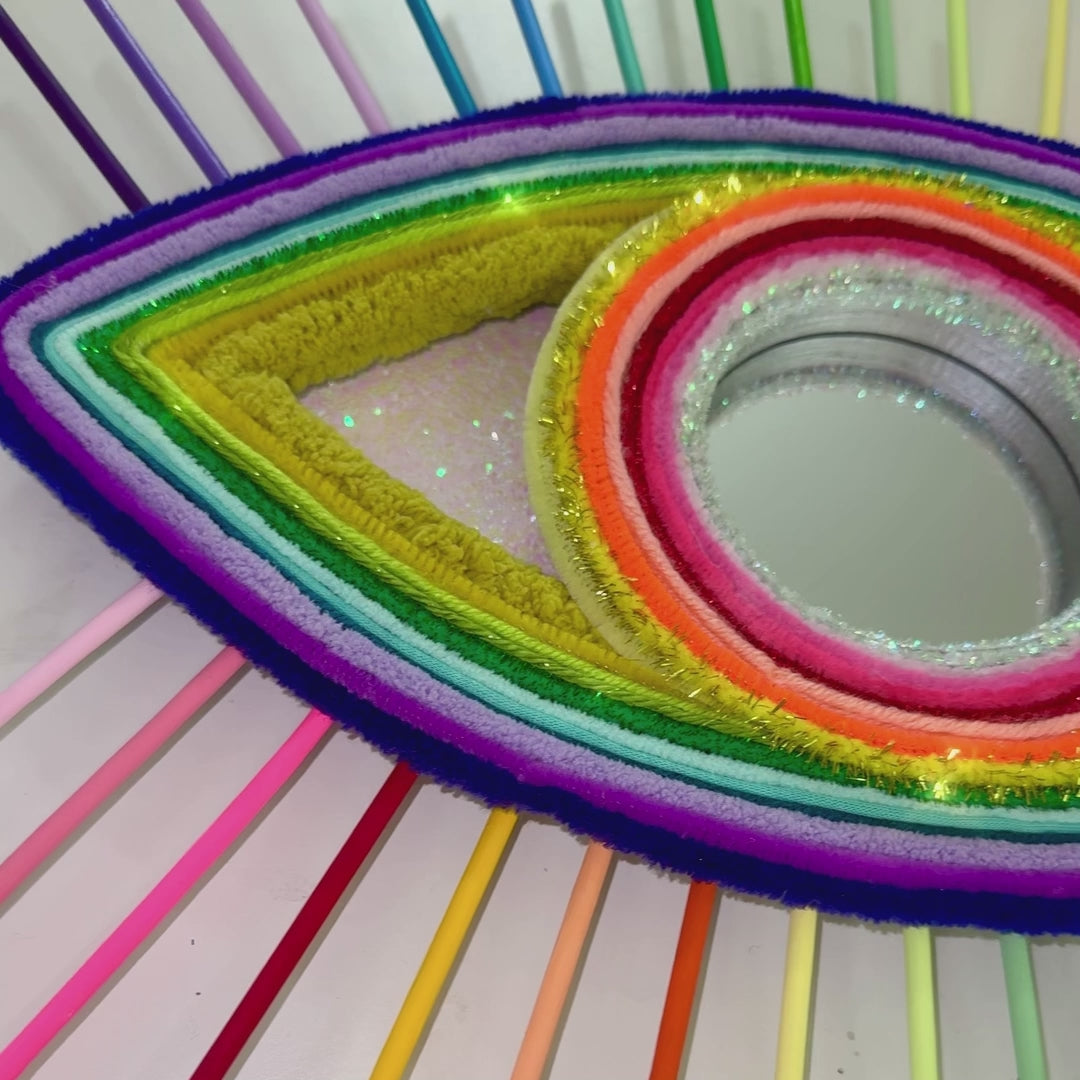 - medium: yarn, pipe cleaners, acrylic paint, glitter, canvas, circular mirror, adhesive on vintage wood frame